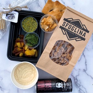 In this collaborative meal kit, Sfoglina produced the pasta course, and Moon Raccoon Baking Co. the bread and dessert. The dry pasta was cooked and the rest of the meal was ready to eat. The meal kit included a recipe with instructions.